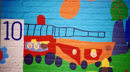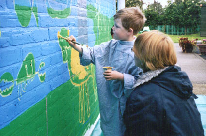 Crawley Green Infant School – Our Environment I worked with four and five year olds on this mural. They drew pictures of their local environment, and sometimes their imagined environment, for the mural.