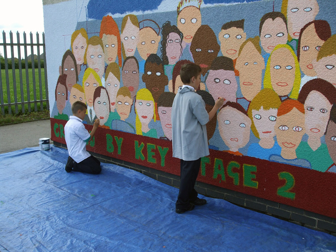 Shibden Head Primary – Self Portraits in a Crowd At Shibden Head they wanted to create a crowd in a stand for the area of the playground where they play football. Children in Years 3, 4 and 5 did self portraits for the crowd and also helped to paint.